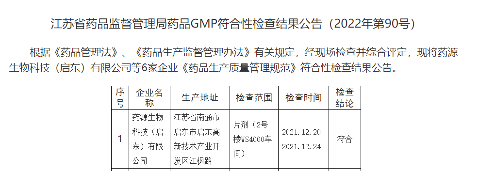 2022年10月,药源生物通过江苏省药监局GMP符合性现场检查